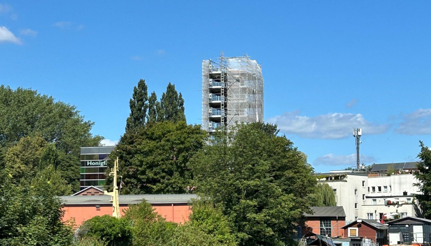 Eingerüstet und verhüllt, so präsentiert sich der Schornstein des Kulturzentrums auf der Elbinsel derzeit. Nachdem DPA schon die An- und Umbaumaßnahme 2008 geplant und durchgeführt haben, sind wir nun mit der Sanierung des Schornsteins beauftragt und das Projekt befindet sich derzeit in der Ausführung. Bei schönstem Sommerwetter zeigt sich der ehemalige Schlot der Fabrik mit Blick über die Elbe.